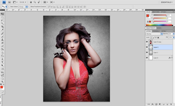 After desaturating the texture, the last thing we want to do for now is to change the blending mode of this layer to Overlay and reduce the Opacity to about 60%. By doing this, the grunge texture will be a little bit more subtle rather than using the colorful variation that we started with. If you haven’t already done so, this would be a good time to save your work. Save, save, and save again… just in case! Don’t lose the work you’ve been slaving on for hours.